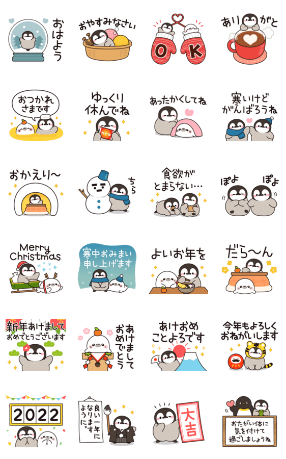 家族・友達・恋人に♪冬に使える言葉がたくさん入ったほのぼの子ペンギンとアザラシの飛び出るスタンプです! (冬・クリスマス・年末年始・お正月・年賀)