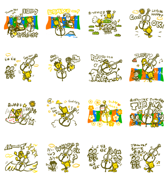 音楽好きな動物と人間たちは、どんな時もいつも仲良しになってしまうスタンプです。