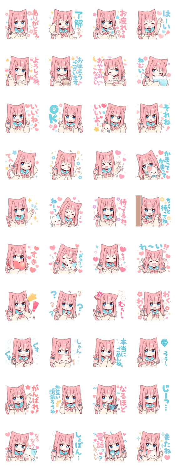 毎日使える挨拶やリアクションが入った桃色のねこさんのスタンプです