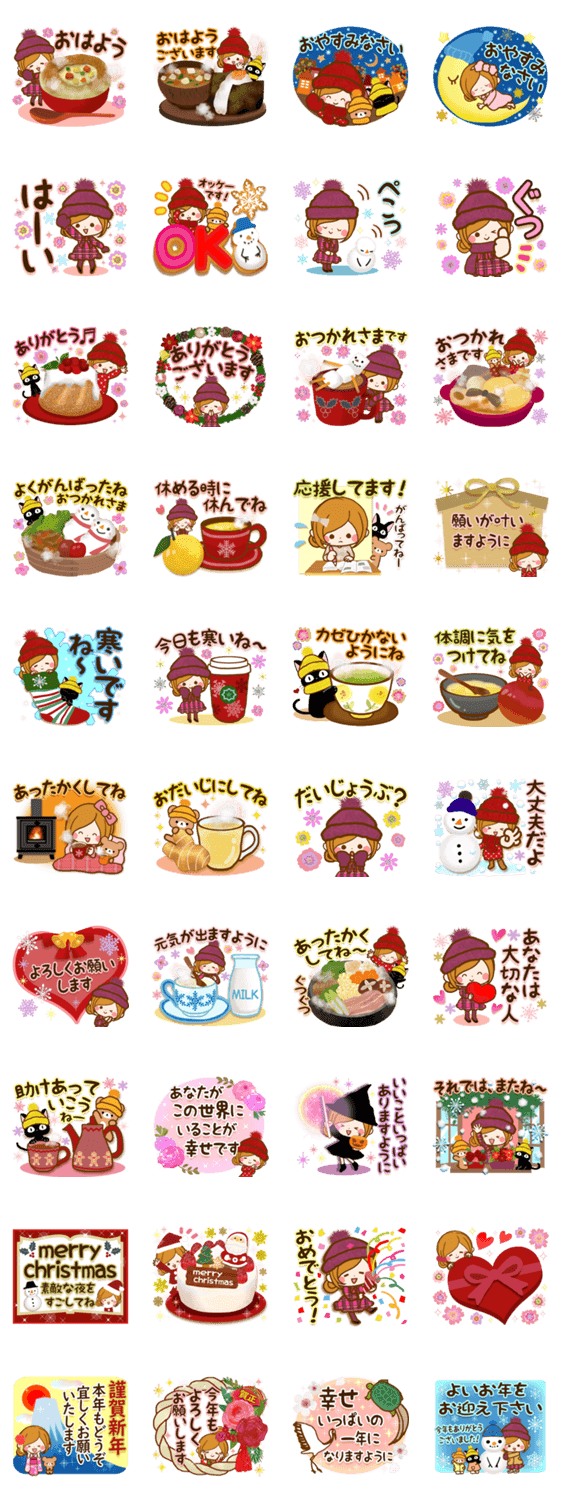 ほっとするあたたかい食べ物、飲み物が多めで、寒い季節にぴったりのやさしい日常スタンプです♪クリスマス、お正月、年賀状がわりにも是非♡「ほのぼのカノジョ」シリーズ