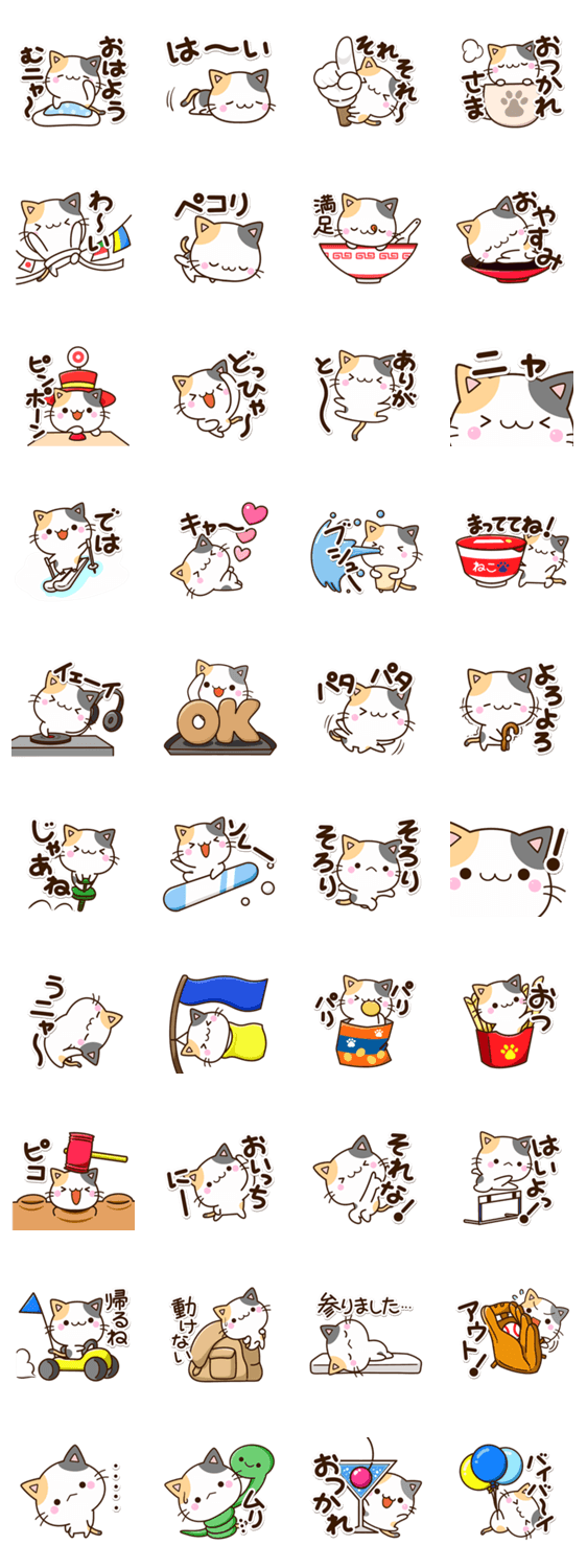 『ちびミケ』の【絵文字】と【着せかえ】もあります!ちいさい三毛猫の、元気にかわいいネコスタンプ。かわいいみけねこ好きな方にぜひ。【かたこ】