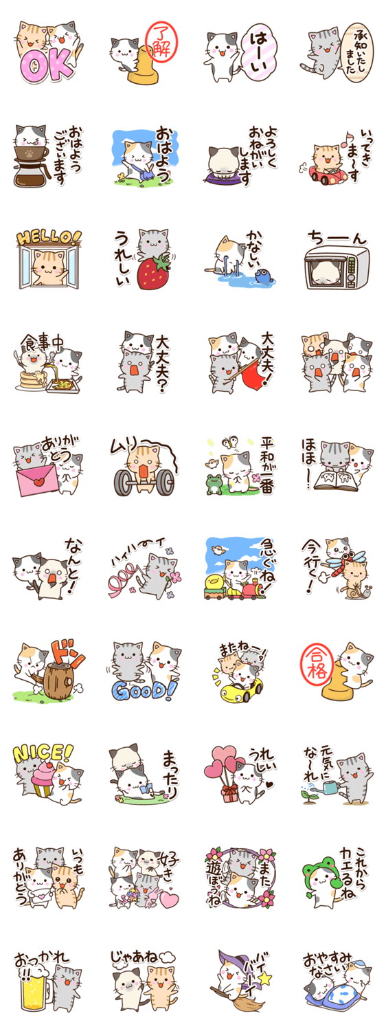 『おちゃめなネコたち』の普段の生活に使える便利なスタンプ。三毛猫、トラねこ、ぶち猫、シャムネコが登場。サバトラやアメショ等の猫好きの方にもぜひ。【かたこ】