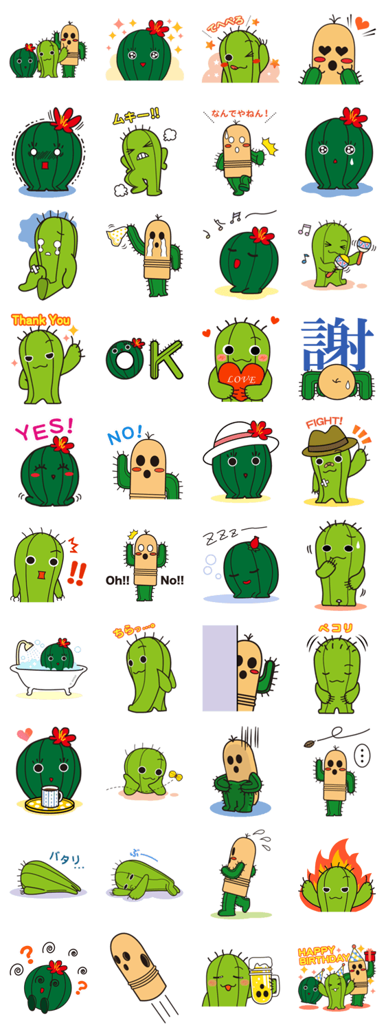 | スタンプ説明 | 実生サボテン生産量日本一を誇る愛知県春日井市で生まれた『春代・日丸・井之介』。春代はおしゃれでおしゃま。日丸は元気なくいしんぼ。井之介は超無口な恥ずかしがりや。 |