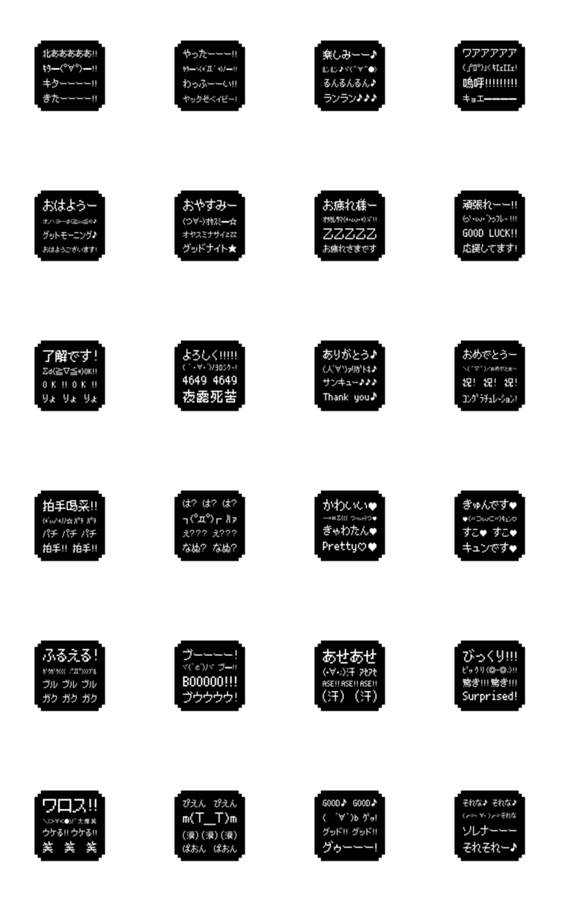 | スタンプ説明 | 顔文字/絵文字/文字が流れる/RPG風/ドット絵/8bit/8ビット/テンション/気持ち/動く/使いやすい/毎日使える/挨拶/あいさつ/煽り/面白い/かわいい/シンプル/ゲーム/アニメ |