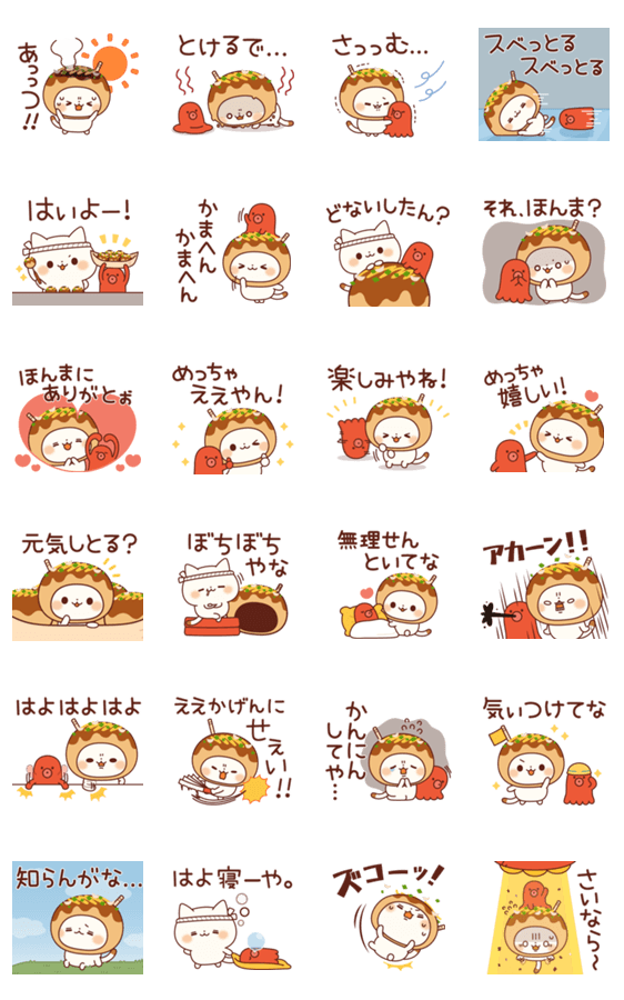 友達や家族、恋人に♪たこ焼きをかぶった可愛いネコさんによるコテコテの関西弁スタンプ第二弾です!毎日のちょっとしたやり取りなど日常会話にとっても便利です。(白猫)