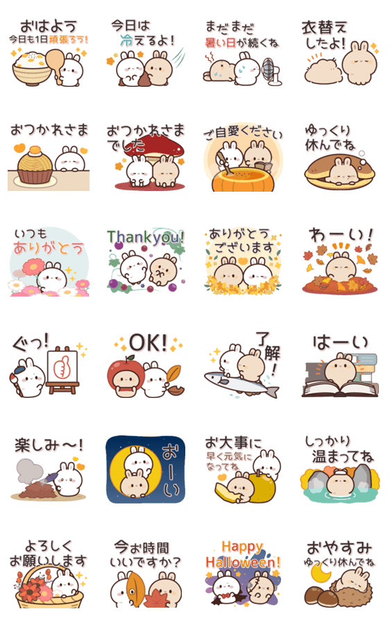 秋をテーマに、挨拶やお返事の言葉を集めたうさぎくん達のポップアップスタンプ 第5弾!家族や友達に沢山使えます♪