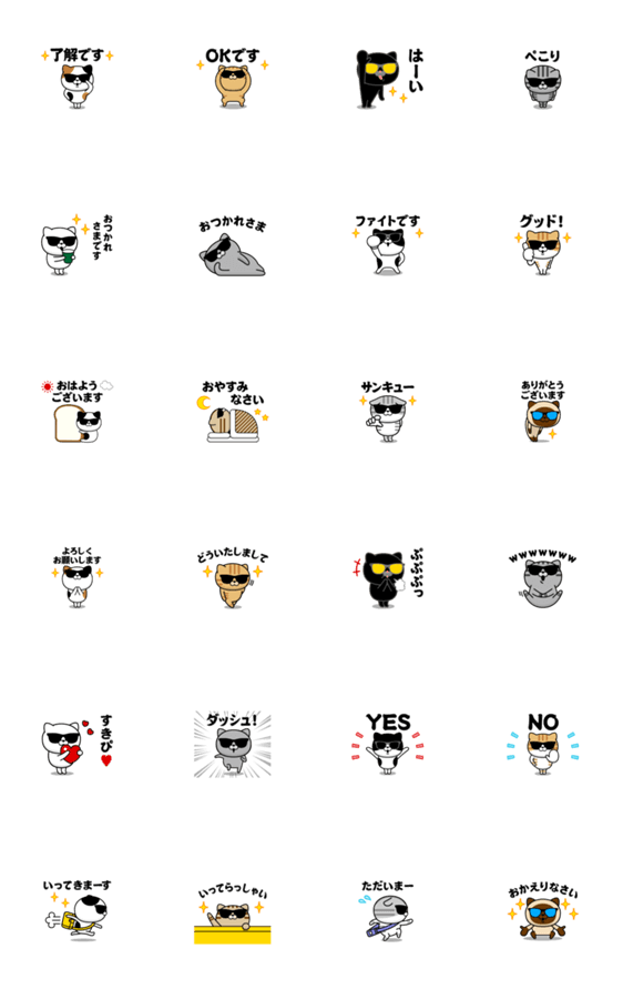 | スタンプ説明 | 飛び出す/ポップアップ/デカ文字/グラサンアニマルズ/サングラス/黒猫/白猫/ポインテッド/ブチネコ/キジトラ/茶トラシロ/ハチワレ/三毛猫/挨拶/日常会話 |