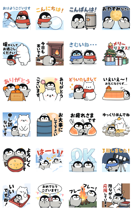 秋の終わりや冬、クリスマスにも使える心くばりペンギンの飛び出すスタンプです♪太字&敬語だから友達や家族、先輩など誰にでも送りやすくて便利です。