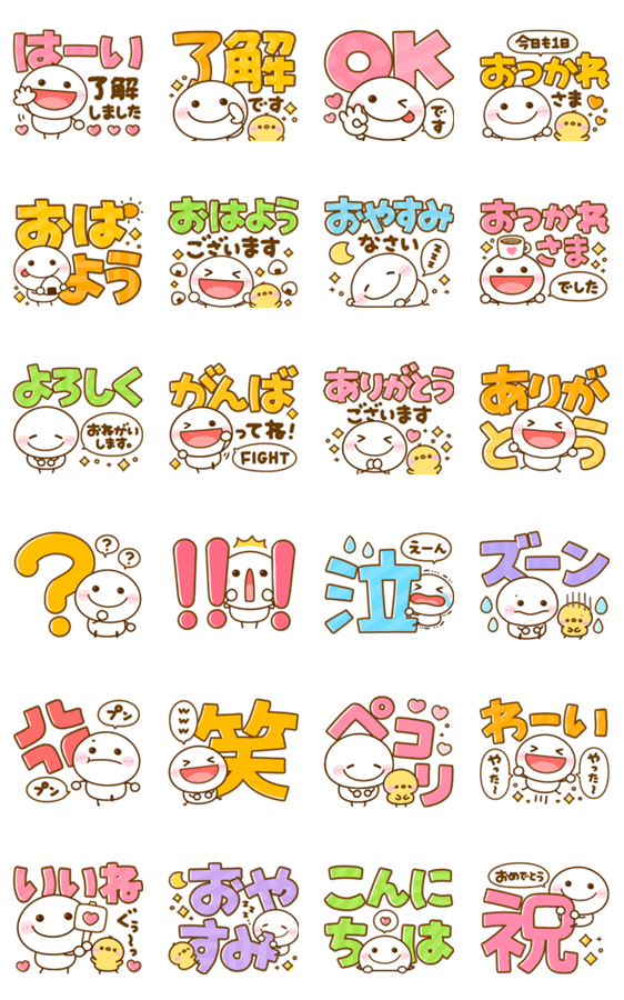 棒人間のちびマロがカラフルなデカ文字と一緒に画面いっぱいに飛び出して動くポップアップスタンプです。