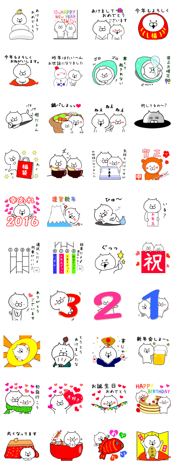 ゆるいねこちゃの年末年始用スタンプです。お誕生日、大晦日、あけおめ、お正月、年賀スタンプ、両手の招き猫ちゃ、カウントダウン、年越しそば、お歳暮など盛り沢山です♪