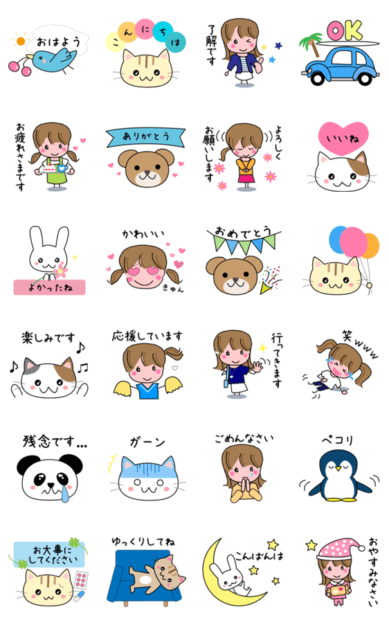 かわいいGIRL&どうぶつたちの毎日よく使う挨拶や会話の言葉が詰まった1年中使えるエフェクトスタンプです。