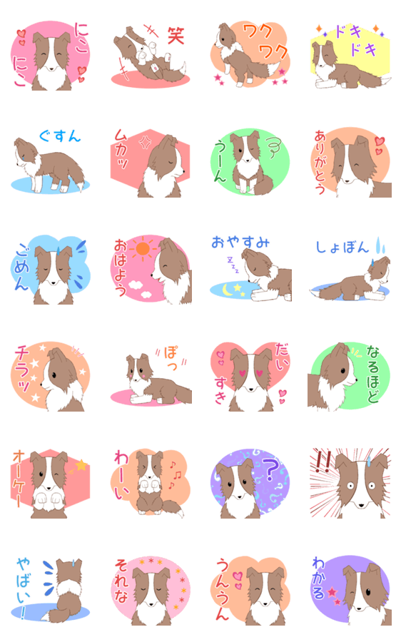 ゆるいボーダーコリーたちのスタンプ第1弾(茶)。チョコ/ブラウン/かわいい/カワイイ/可愛い/犬/もふもふ/モフモフ/感情/気持ち