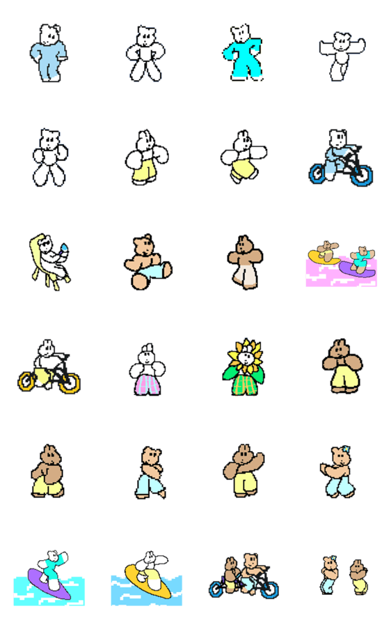 | スタンプ説明 | ドット絵のくまきちときんたろうがダンスするよ。日焼け姿もポイント! |