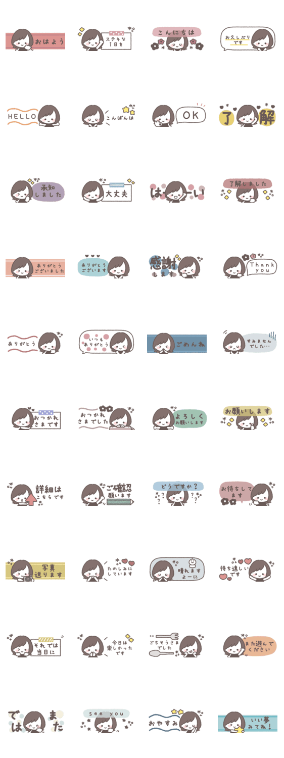 一つあると便利な女の子のスタンプです。 女の子/ボブ/大人可愛い/シンプル/あいさつ/吹き出し/くすみカラー/省スペース