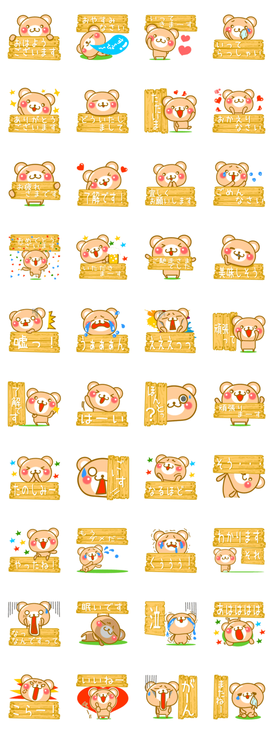可愛いクマが木製の看板(ウッドボード)を使って、日常でよく使うメッセージをあなたに伝えます。毎日使えそうな言葉がいっぱい!!
