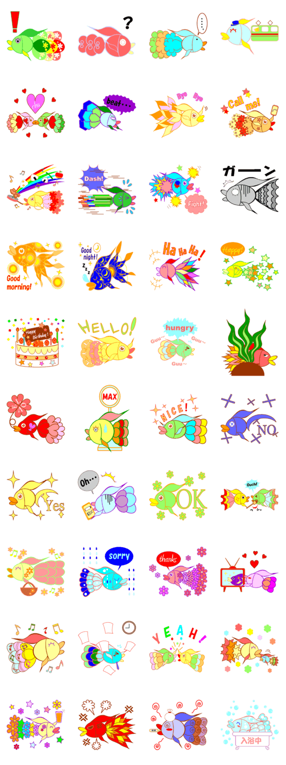 | スタンプ説明 | カラフルで可愛いお魚さん達と一緒に日常会話を華やかに楽しもう!!! |