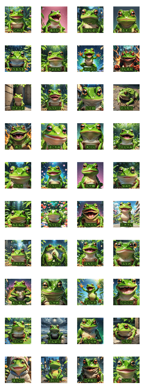 40種類の感情あふれるカエルスタンプ! 日常会話であいさつ・喜怒哀楽を楽しく伝えられます。