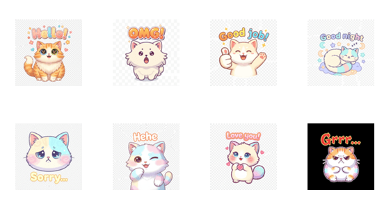 Cute cat stickers for your daily chats. Express your feelings with various expressions and English messages.