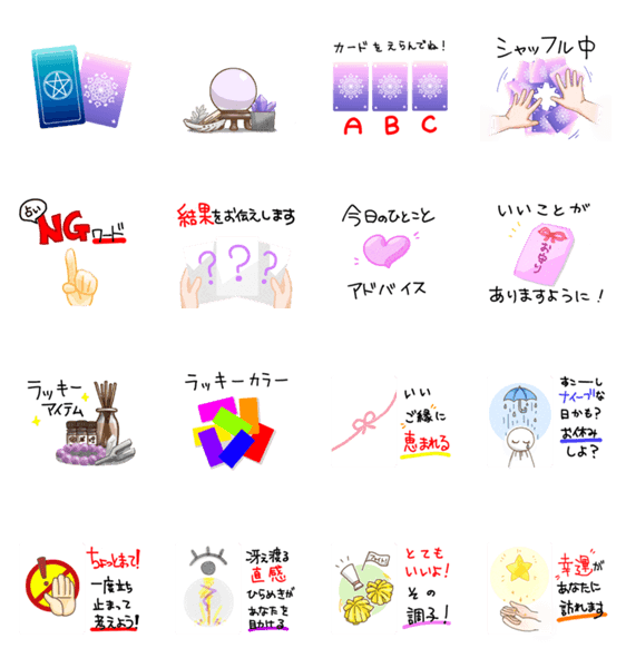 占いでも日常の会話でも使える、やさしい雰囲気のスタンプです。