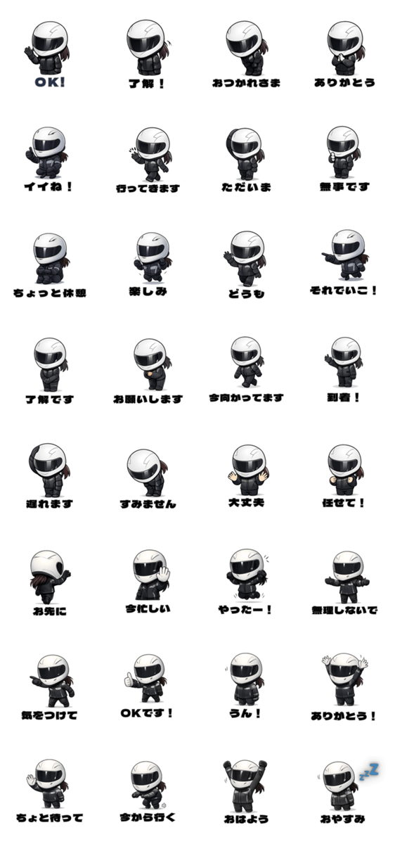 | スタンプ説明 | フルフェイスヘルメットのライダーをモチーフにした、 シンプルで使いやすいスタンプセットです。 日常会話に自然に使える、短く分かりやすい表現を揃えました。 |