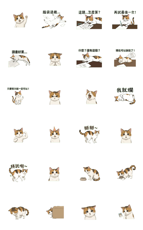 | スタンプ説明 | A hardworking cat goes brain overload! Perfect for school, work, and life struggles. |