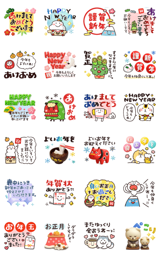 お正月のあいさつに年賀状代わりに使えるポップアップスタンプです。あけおめ/ことよろ/よいお年を/冬/喪中/賀正/謹賀新年