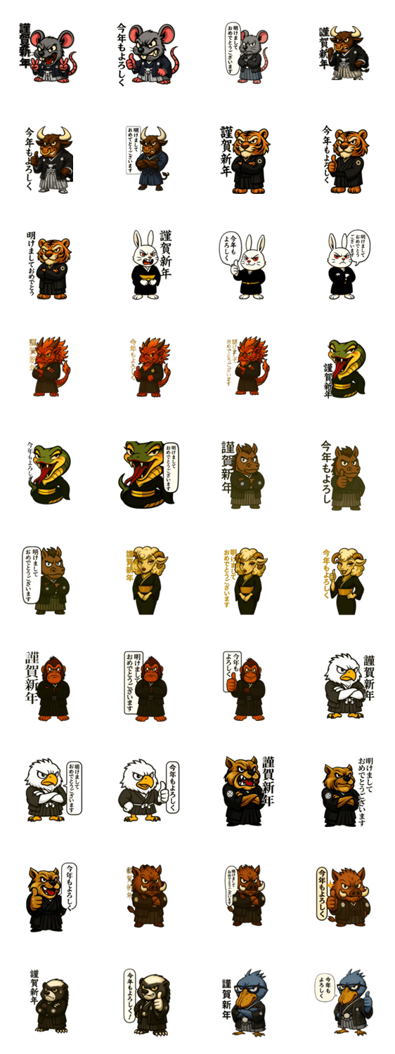 着物を着た十二支 毎年使えるスタンプ 子、丑、寅、卯、辰、巳、午、未、申、酉、戌、亥 新年 正月 年越し 新年の挨拶 明けましておめでとうございます