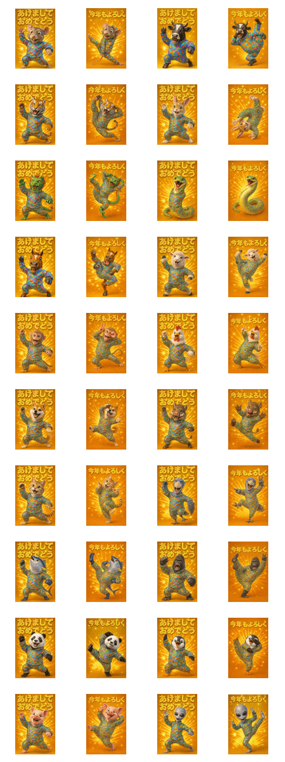 面白いずっと使えるあけおめ十二支と他動物