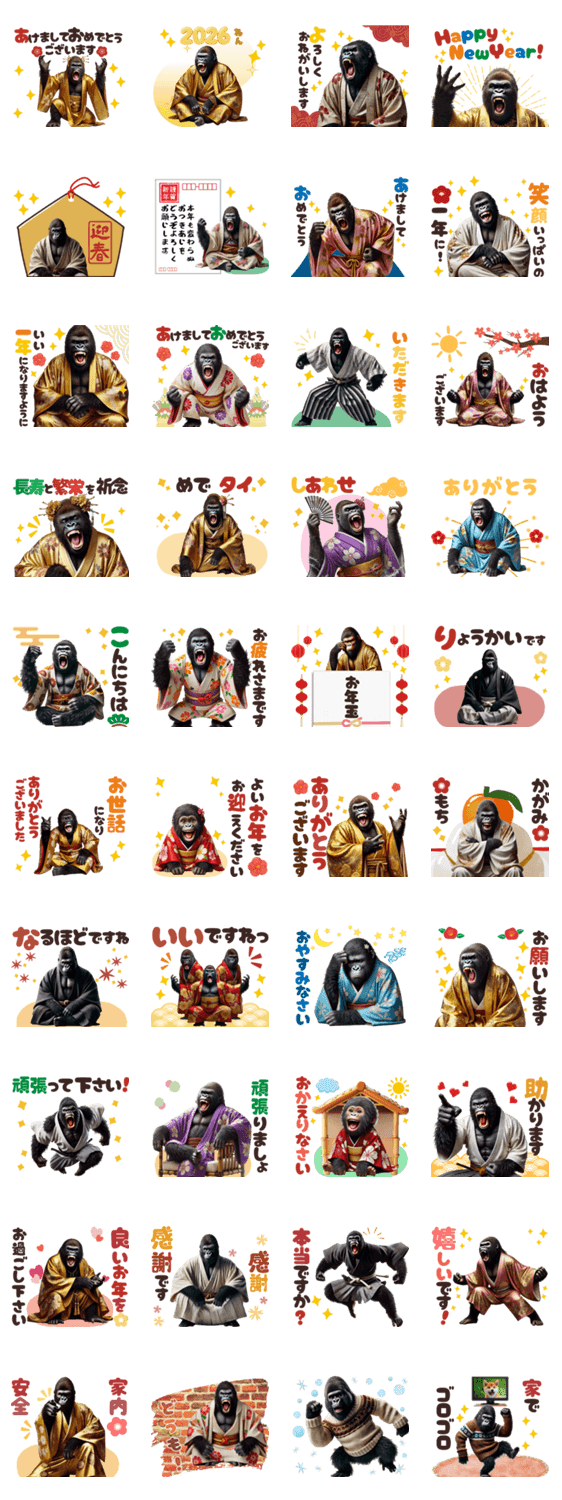 年末年始に使えるお正月を祝うゴリラスタンプが再販! 笑い多くなるLINEで会話を楽しく!! 2026年/あけおめ/ゴリラ/ネタ/面白/年賀状/新春/正月/お年玉
