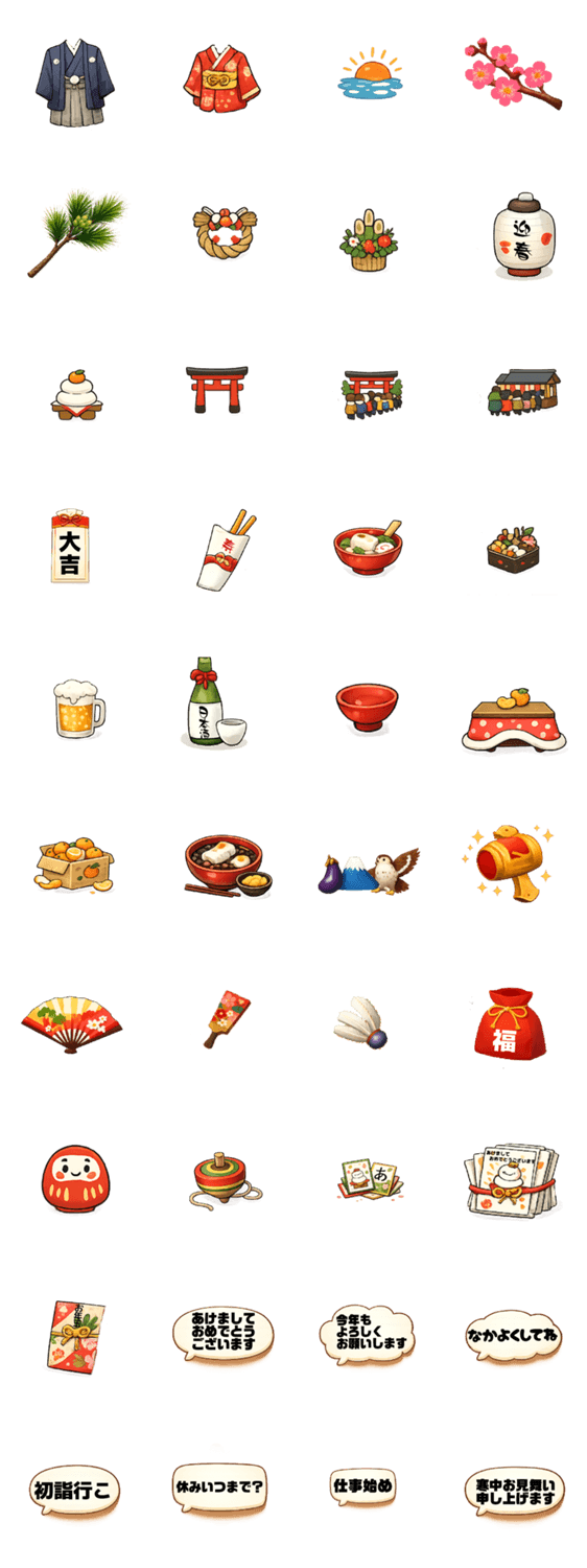 お正月に使える、かわいい和風アイテムと吹き出しのスタンプです。年始や日常スタンプと組み合わせて自分だけのメッセージにアレンジできます。