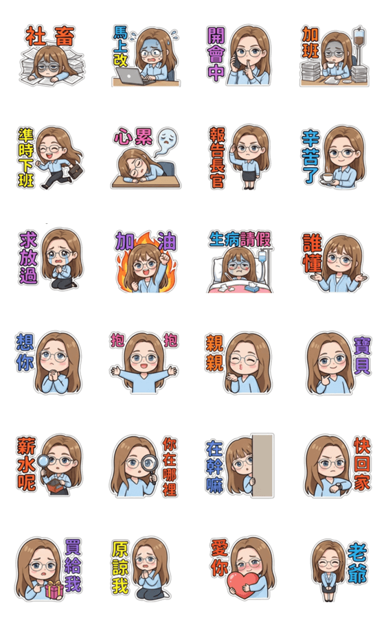 | スタンプ説明 | Cute Girl's here! Features office life (OT, sick) & sweet couple chats (Hubby, kiss). 12 practical Q-style stickers for work & home. Get this adorable set now! |