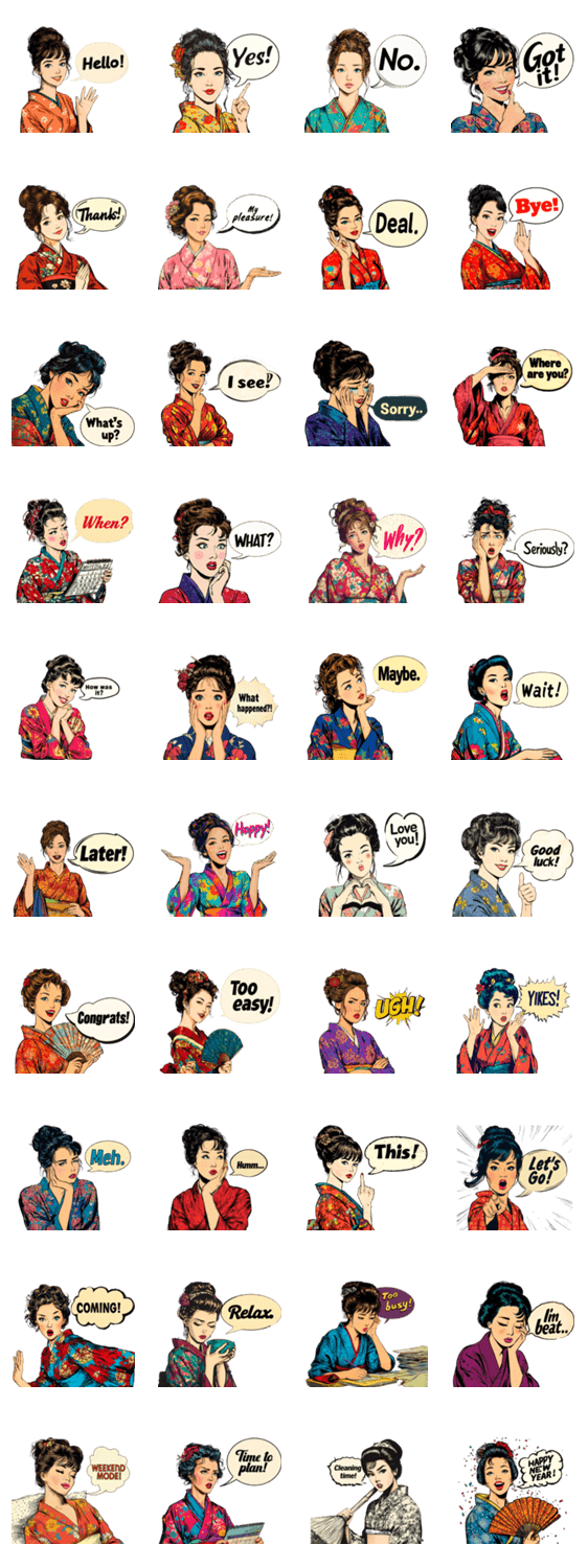 毎日使えるアメコミ風レトロ女子の英語スタンプ第2弾☆ 着物姿のレトロ女子が、HelloやThanksなど 毎日使いやすい英語フレーズでトークを彩ります!