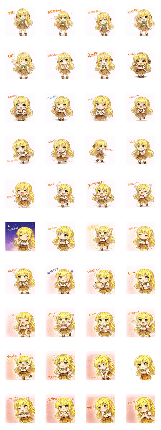 | スタンプ説明 | 金髪ちびっこが大活躍!「おはよう」「了解」「だめっ!」など、毎日使えるあいさつ&リアクションがぎゅっと詰まったスタンプです。 |