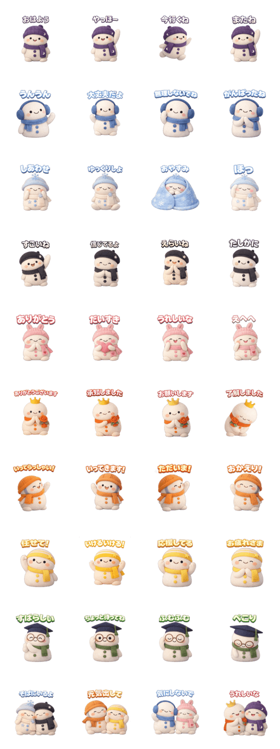 | スタンプ説明 | ぬいぐるみみたいな、やさしい表情のゆきだるまたち。 毎日の会話で使いやすい言葉をたくさん集めました。 友だちや家族とのやりとり、推し活にもそっと寄り添います。 |