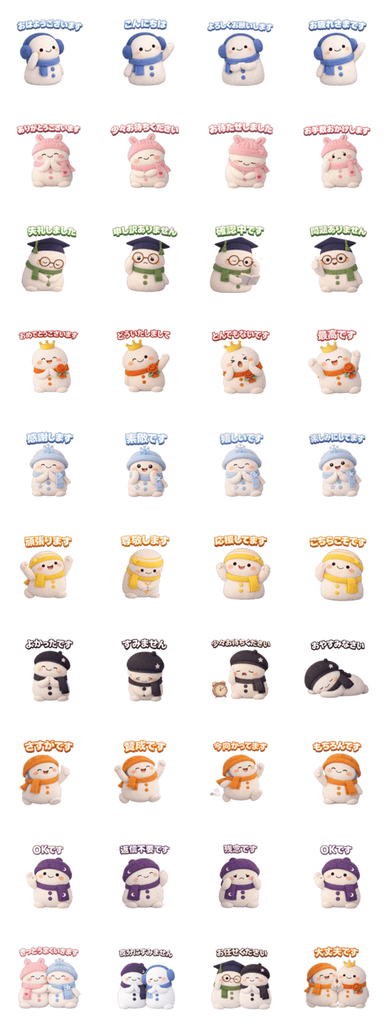 | スタンプ説明 | ぬいぐるみみたいな、やさしいゆきだるまの敬語スタンプ。 仕事や目上の方との会話にも使いやすい言葉を揃えました。 やさしく丁寧に気持ちを伝えたいときに。 |