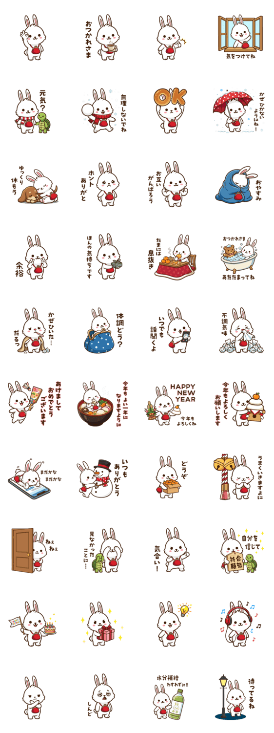 気遣いのできるうさぎのスタンプです。年末年始の挨拶にも使えるスタンプセットです。挨拶/祈願/うさぎ/かめ