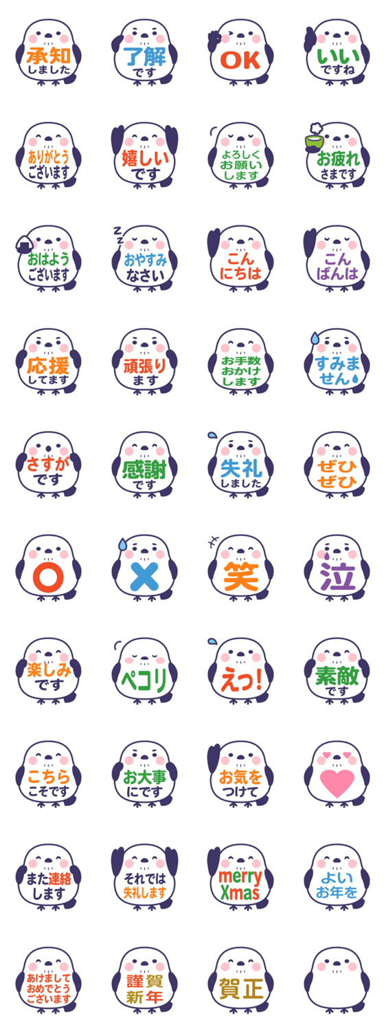 | スタンプ説明 | 簡単な返信で使いやすい、雪の妖精シマエナガの敬語のスタンプです。了解です/承知しました/お疲れさまです など。年末・年賀の絵文字付き! |