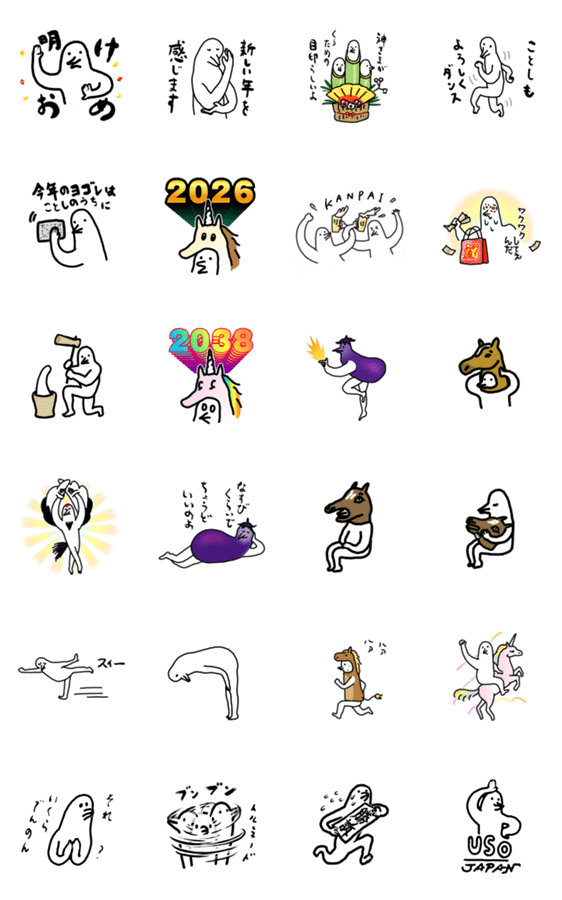 使いやすい鳥が年末年始を楽しむスタンプです。お正月や冬に使えるショットの他、馬もがたくさん。