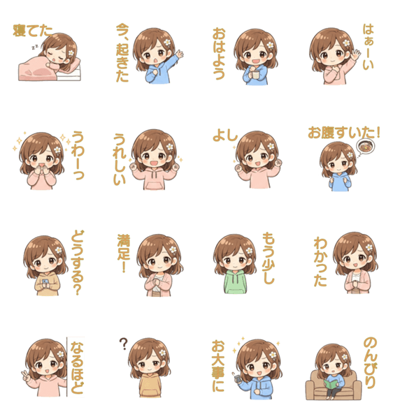 | スタンプ説明 | がんばり屋の「りんこ先輩」、今日はちょっとひと休み。 おうちでごろごろ、うたた寝、のんびり時間。 癒し系スタンプです。 |