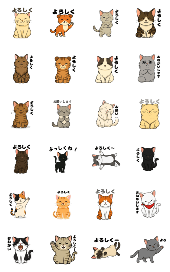 「ありがとう~」猫「了解」猫シリーズの第3弾。よろしくやお願いする猫たちのスタンプです。