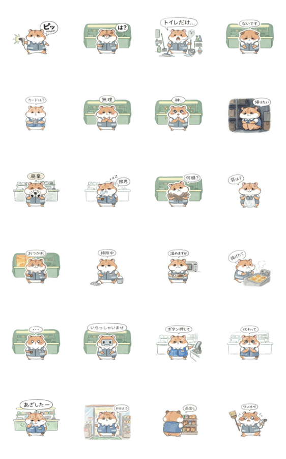 日本中どこにでもあるコンビニで働く、少し太ったハムスターのスタンプです。ワンオペ、年齢確認、廃棄弁当。「袋いりますか?」深夜バイト、フリーター、学生の日常に。