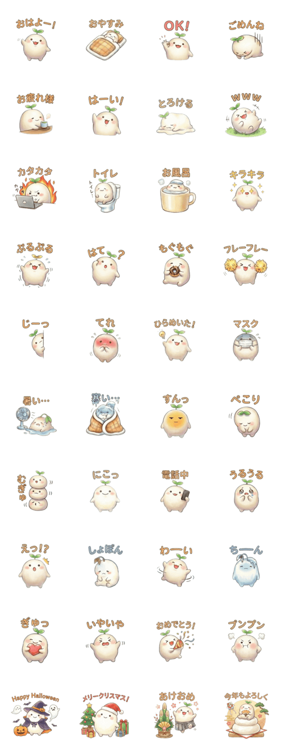 | スタンプ説明 | 世間では大根と呼ばれていますが、謎の癒しキャラ『フタバもん』です。(※野菜コーナーには売っていません) 季節のイベント, 毎日の挨拶など、一年中使えるセットです。 |