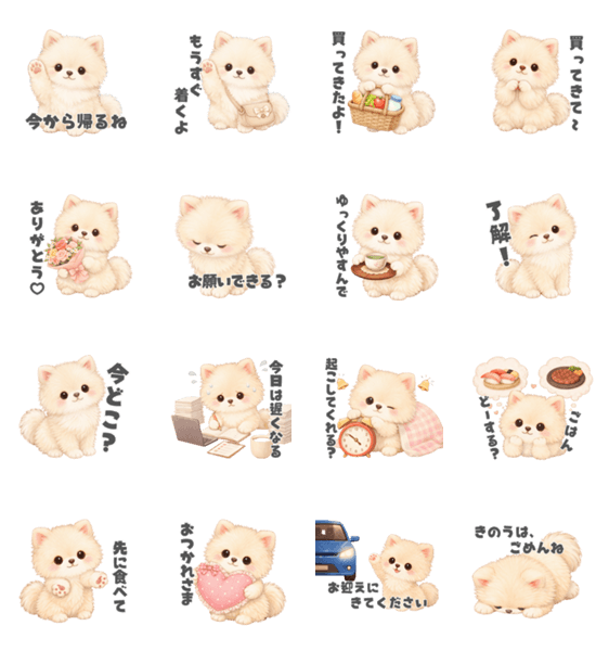 | スタンプ説明 | 夫婦や家族との毎日の連絡に使いやすい、白ポメの生活スタンプです。 「今から帰るね」「ごはんどうする?」など、日常会話にちょうどいい言葉を揃えました。 |