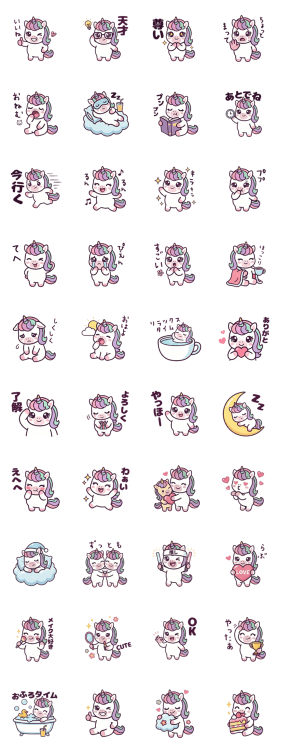 ふわふわで可愛いユニコーンのスタンプです。 あいさつやリアクションなど、毎日のトークで使いやすい表情をたっぷり詰め込みました。