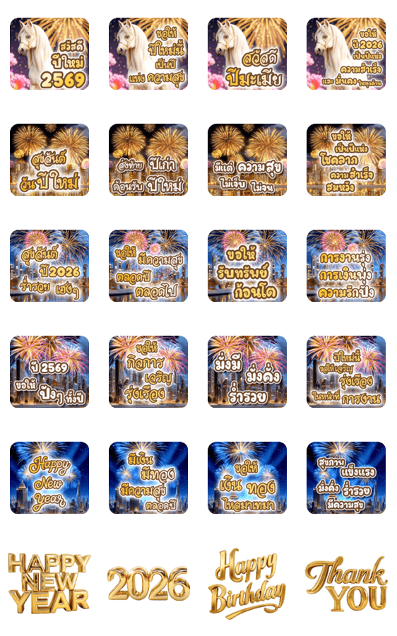 | スタンプ説明 | Adorable Horse Happy New Year 2026, 2569, Year of the Horse, greetings Holidays cute Fireworks festival colorful Happy Birthday 3D Big Pop Up Stickers Animation |