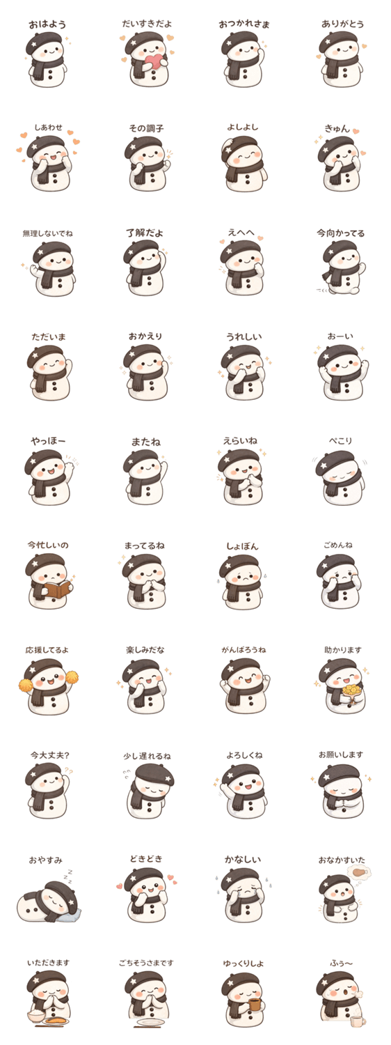 | スタンプ説明 | 落ち着いた黒のゆきだるまが、毎日の気持ちをやさしく伝えます。 推し活トークや普段の会話にもぴったり。 大人かわいい雰囲気で、そっと寄り添うスタンプです。 |