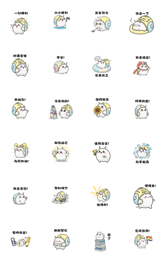 | スタンプ説明 | DouDou's appearance: A round little snail with handwritten slogans like "Try harder" and "Next time for sure" drawn on its shell, along with comfort stickers. |