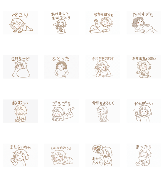 | スタンプ説明 | ゆるくてだらだらした女の子の年末年始スタンプです。 「今年もぼちぼち」「正月もーど」など、年末の挨拶からお正月休みのだらだらした日常まで力が抜けた挨拶にぴったり |