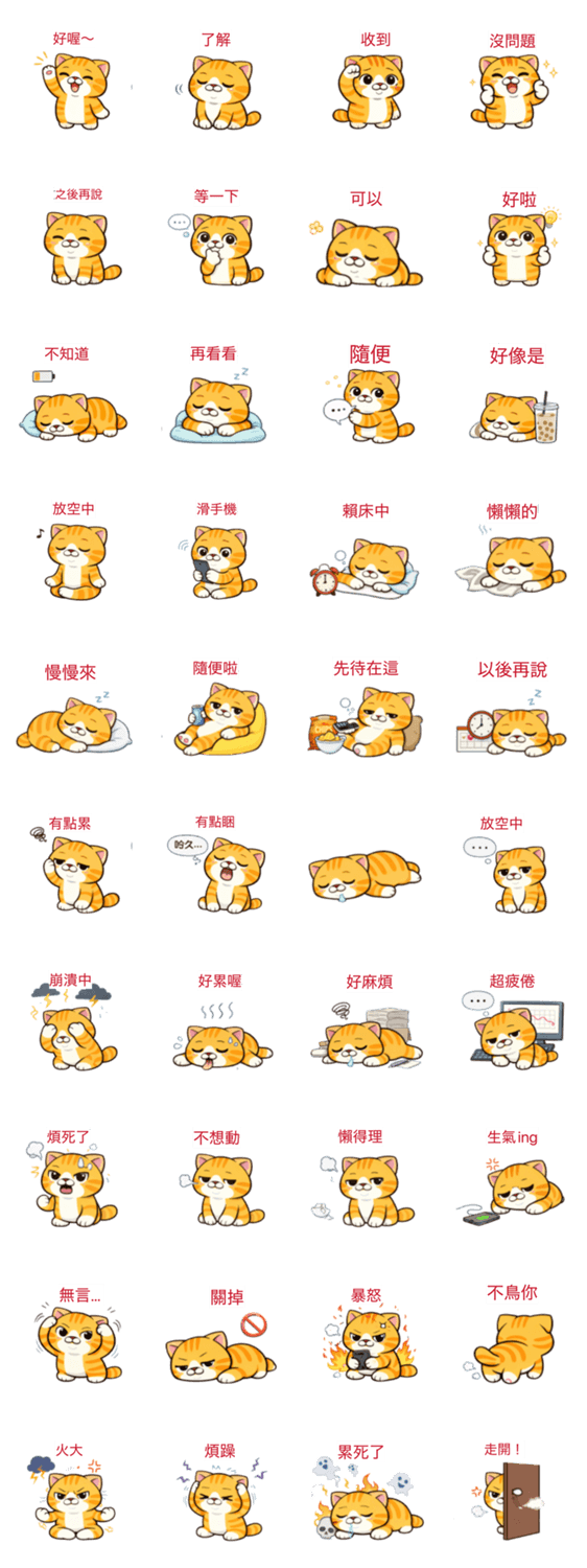今天不想努力、只想懶懶地過一天。 這是一隻什麼都不急、什麼都隨便的橘貓、包含回覆用、發呆、放空、賴床、疲累、沒幹勁等 超日常、超好用的40張貼圖。