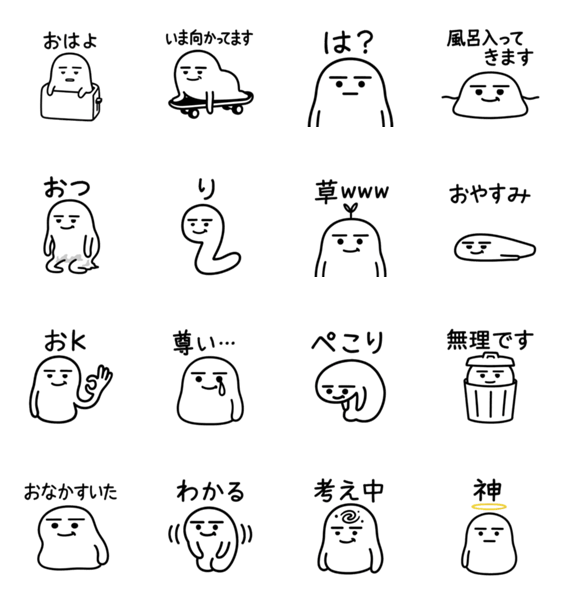 絶妙なニヤけ顔と無表情が特徴の白い豆キャラ。やる気がない時や、シュールに返信したい時に便利なスタンプです。